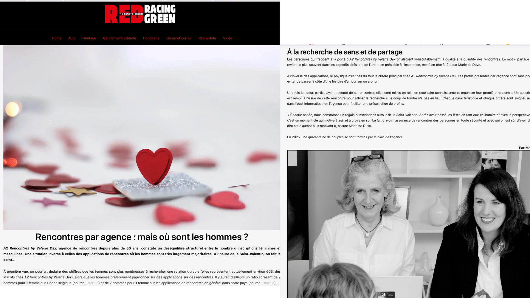 Le webzine Red Racing Green s'est récemment penché sur la dynamique des rencontres actuelles et la place des hommes au sein des agences. C'est une excellente occasion de souligner que, face à la superficialité des algorithmes, notre méthode humaine fait plus que jamais la différence. Après tout, les belles histoires méritent bien plus qu'un simple balayage sur un écran !